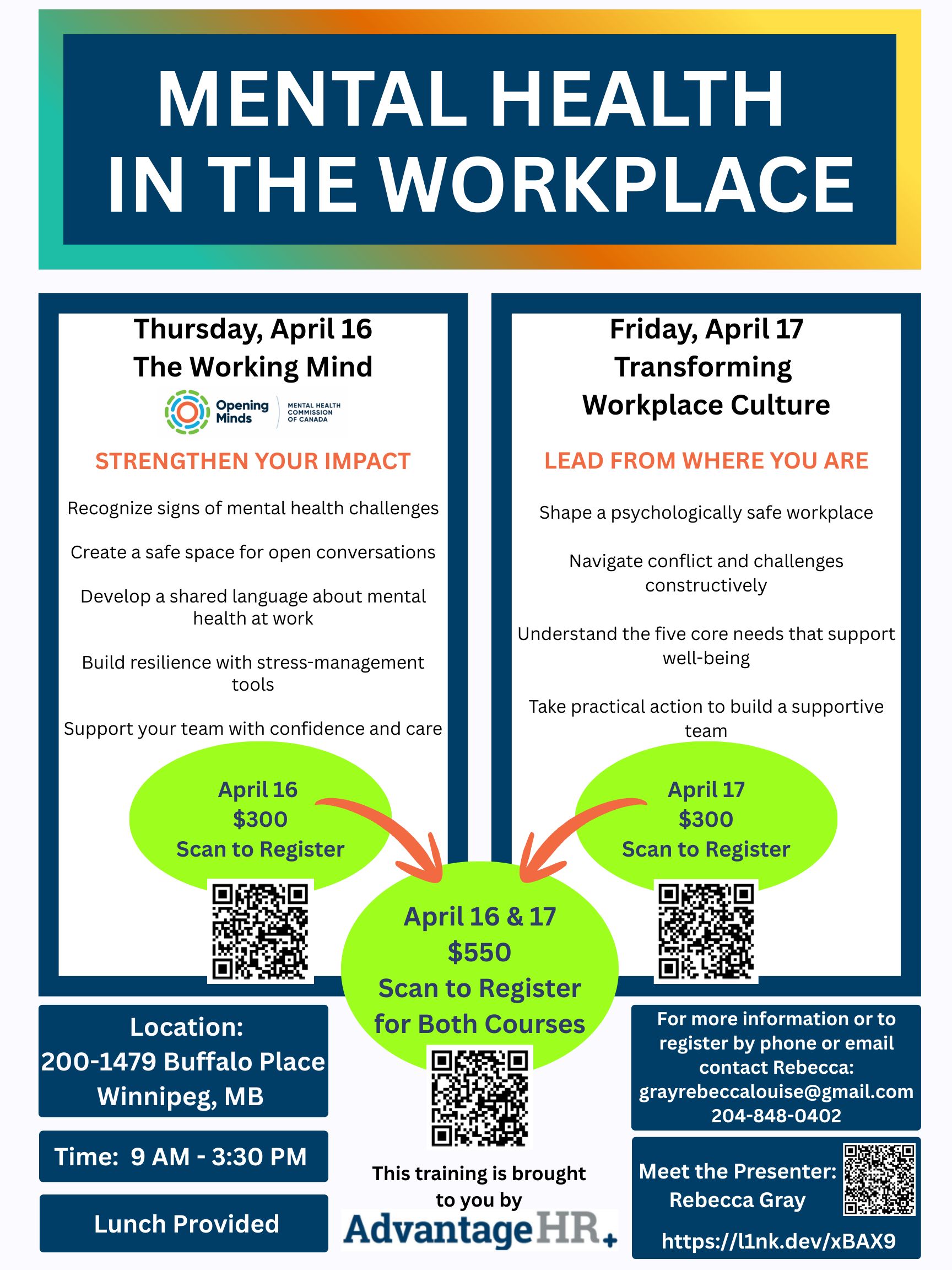 Advantage HR+ is sponsoring a practical, engaging workplace mental wellness training to help employees and management at every level make a meaningful difference in their work environment.